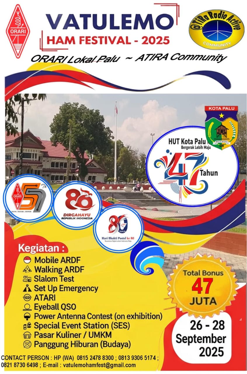 Dalam rangka memeriahkan Hari Ulang Tahun (HUT) Kota Palu ke-47 sekaligus memperingati sejumlah momentum penting nasional, Organisasi Amatir Radio Indonesia (ORARI) Lokal Palu bersama Atira Community akan menggelar Vatulemo HAM Festival 2025. Acara ini dijadwalkan berlangsung pada 26–28 September 2025 di Gedung JCC & Lapangan Immanuel, Jl. M. Yamin, Kota Palu, Sulawesi Tengah. Festival ini tidak hanya menjadi perayaan HUT Kota Palu, tetapi juga dirangkaikan dengan peringatan HUT ke-80 Republik Indonesia, HUT ke-57 ORARI (9 Juli 2025), serta Hari Bakti Postel ke-80 (9 September 2025). Kegiatan ini menargetkan partisipasi seluruh…